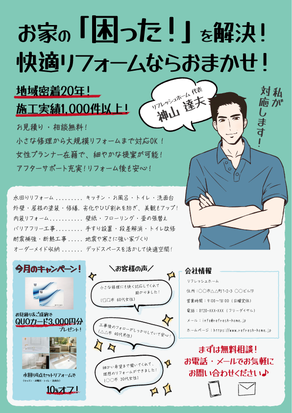 チラシを作ろうと考えたときに、どれくらい費用がかかるのか、イメージ通りのものができるか、何を載せればいいのか……と、いろいろ不安がありました。 |